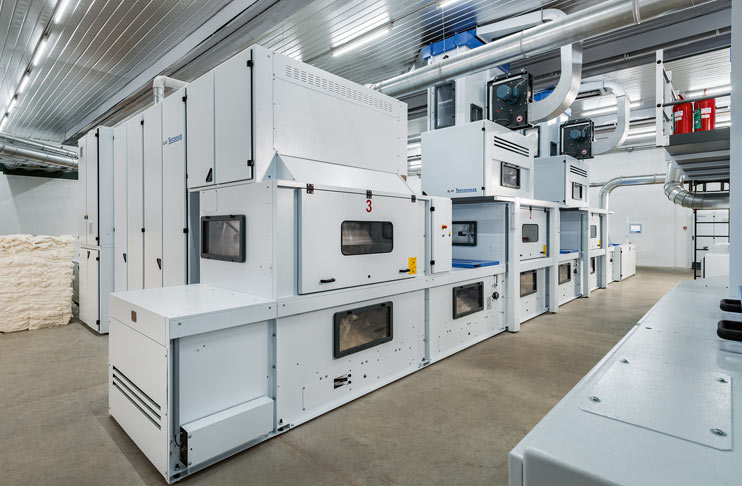 Truetzschler’s T-BLEND tuft blending system ensures reproducible blending consistency through a self-monitoring system. The T-BLEND is well-suited to the task of blending natural or man-made fibers of different lengths, finenesses, and colours. The T-BLEND can blend two to six components thus resulting in an application range that covers standard blends (50% cotton/50% polyester) to the addition of small fibre options (as little as 1% black fibres) or even colour melanges. The T-BLEND is designed for high productivity – up to 2000kg/h.